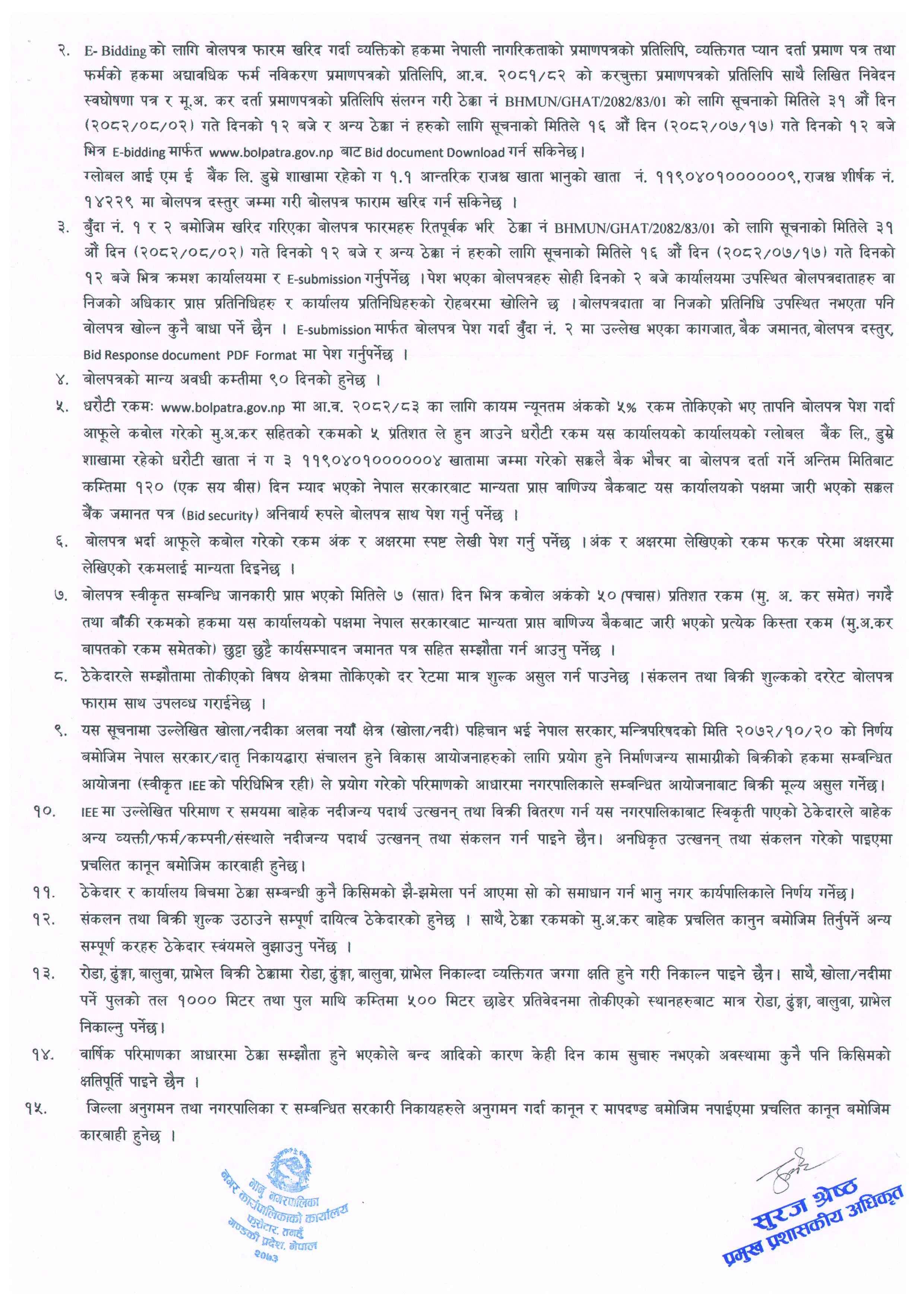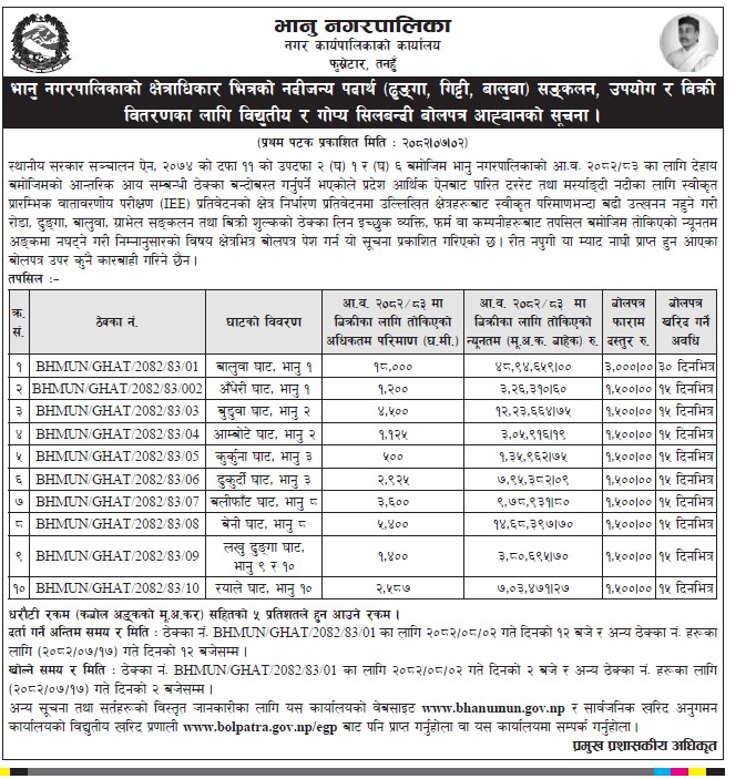 भानु नगरपालिकाको क्षेत्राधिकार भित्रको नदीजन्य पदार्थ (ढुङ्गा, गिट्टी, वालुवा) सङ्कलन, उपयोग र विक्री वितरणका लागि विद्युतीय र गोप्य सिलबन्दी बोलपत्र आव्हानको सूचना !