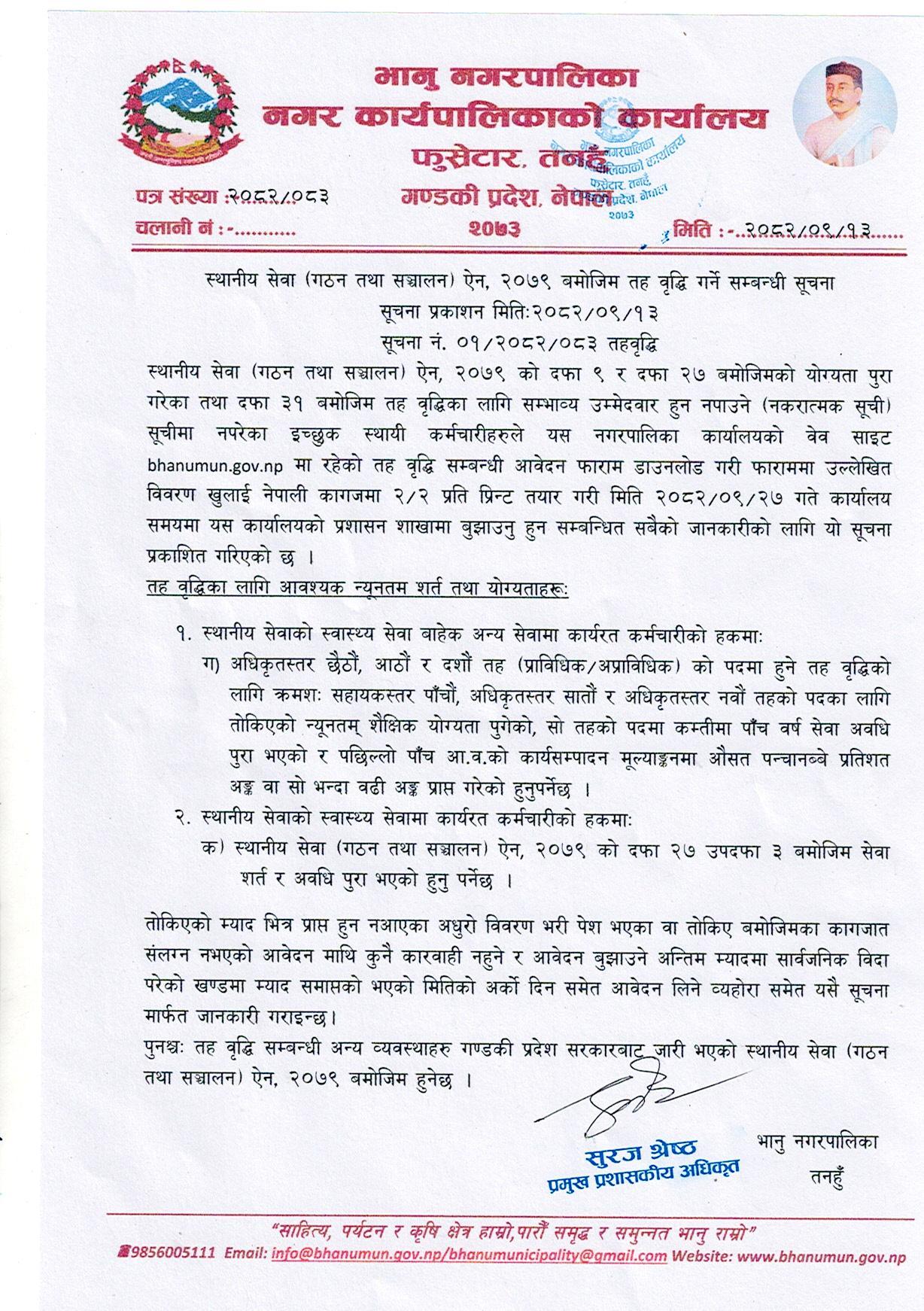 स्थानीय सेवा (गठन तथा सञ्चालन) ऐन, २०७९ बमोजिम तह बृद्धि गर्ने सम्बन्धी सूचना!!!