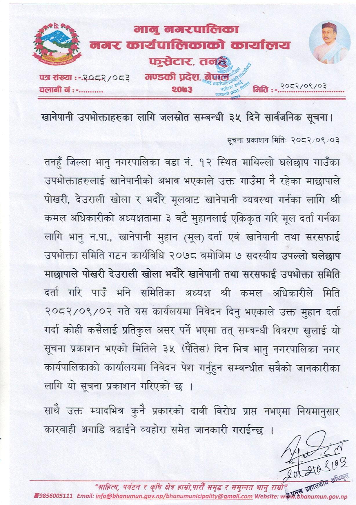 खानेपानी उपभोक्ताहरुका लागि जलस्रोत सम्बन्धी ३५ दिने सार्वजनिक सूचना!!!