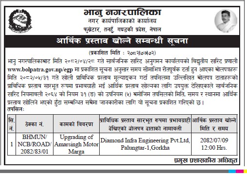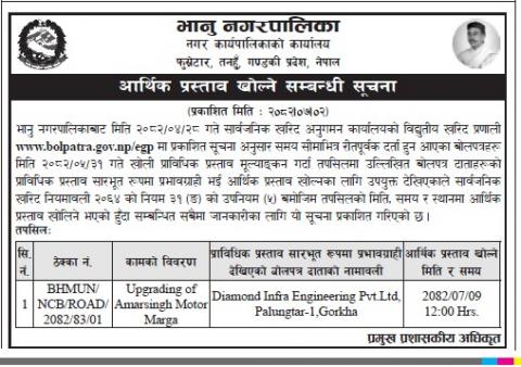 » आर्थिक प्रस्ताव खोल्ने सम्बन्धी सूचना। Upgrading of Amarsingh Motor Marga