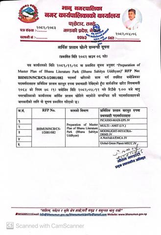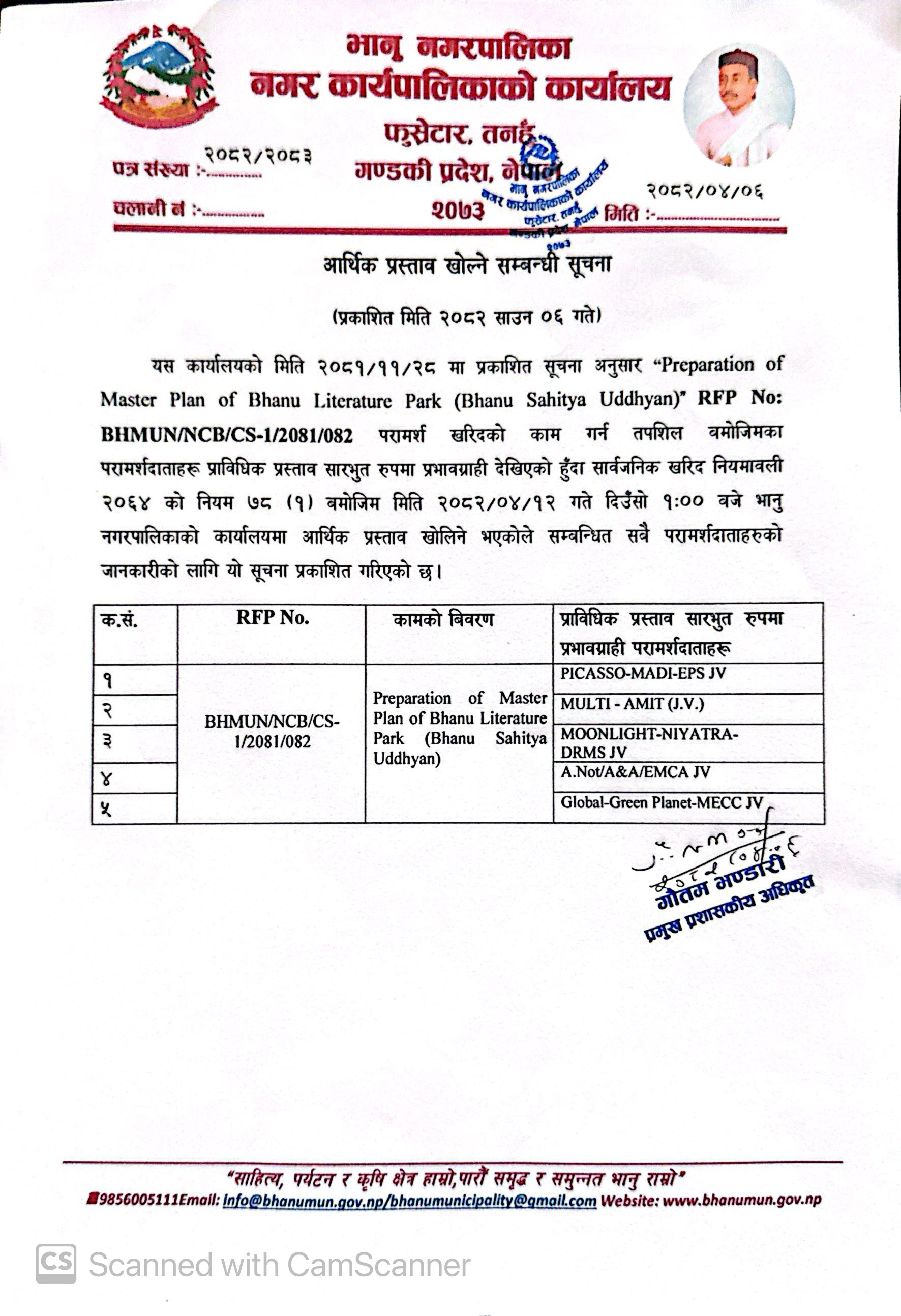 भानु नगरपालिकाको क्षेत्राधिकार भित्रको नदीजन्य पदार्थ (ढुङ्गा, गिट्टी, वालुवा) सङ्कलन, उपयोग र विक्री वितरणका लागि विद्युतीय र गोप्य सिलबन्दी बोलपत्र आव्हानको सूचना !