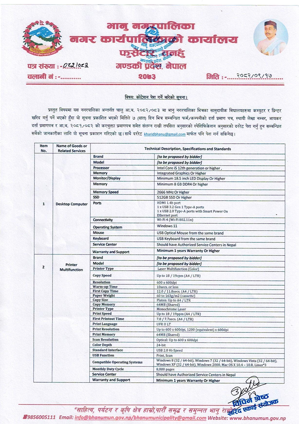 Invitation of Electronic Bids for Construction of Bhanu Municipality Welcome Gate.