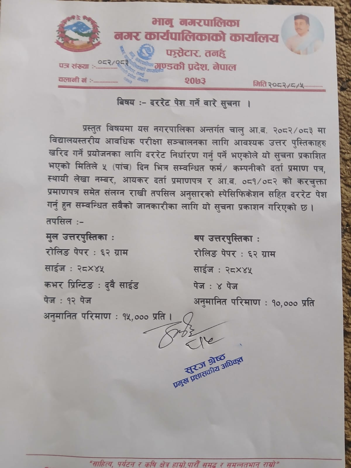 भानु नगरपालिकाको क्षेत्राधिकार भित्रको नदीजन्य पदार्थ (ढुङ्गा, गिट्टी, वालुवा) सङ्कलन, उपयोग र विक्री वितरणका लागि विद्युतीय र गोप्य सिलबन्दी बोलपत्र आव्हानको सूचना !