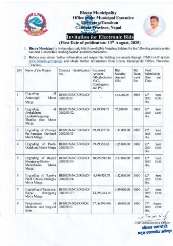 भानु नगरपालिकाको क्षेत्राधिकार भित्रको नदीजन्य पदार्थ (ढुङ्गा, गिट्टी, वालुवा) सङ्कलन, उपयोग र विक्री वितरणका लागि विद्युतीय र गोप्य सिलबन्दी बोलपत्र आव्हानको सूचना !