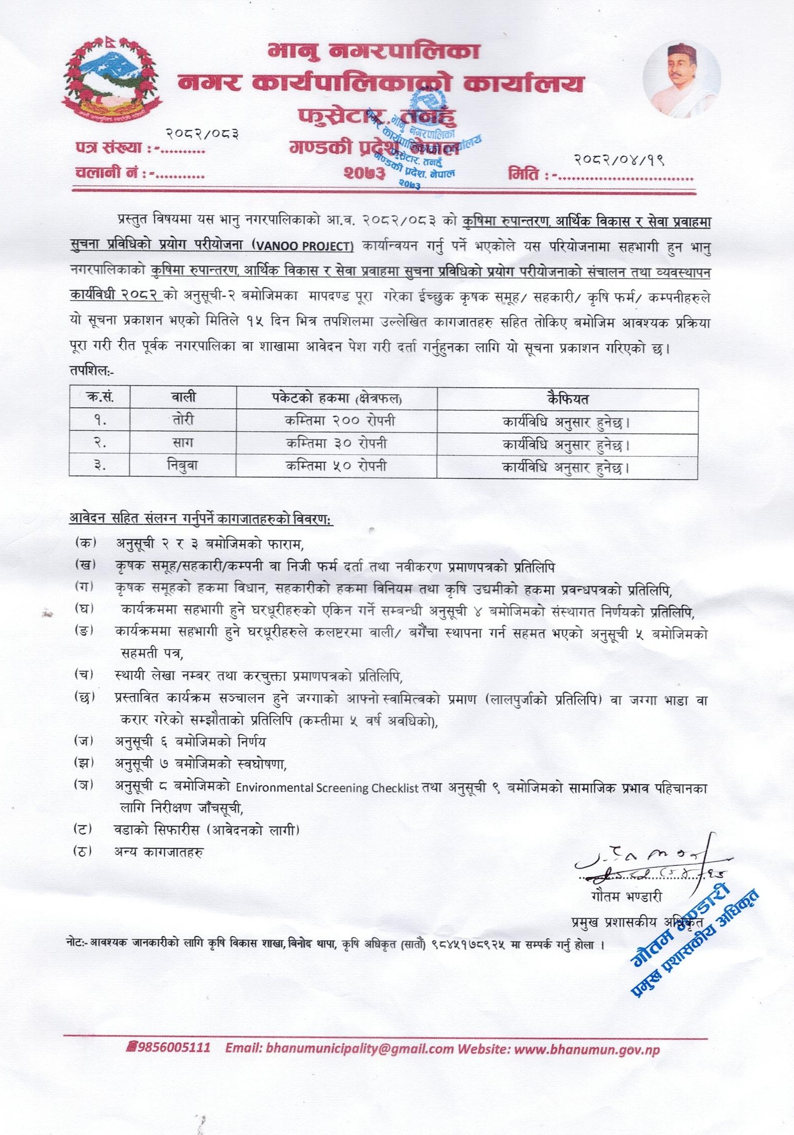 कृषिमा रुपान्तरण,आर्थिक विकास र सेवा प्रवाहमा सुचना प्रविधिको प्रयोग परीयोजना (VANOO PROJECT)कार्यान्वयनका लागि आवेदन पेश गर्ने सम्बन्धी सूचना!!