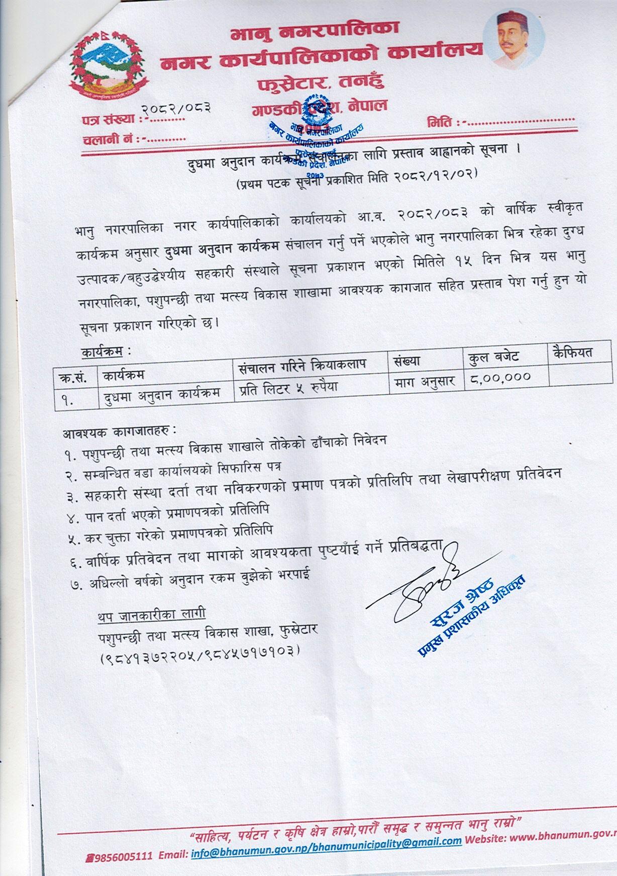 दुधमा अनुदान कार्यक्रम संचालनका लागि प्रस्ताव आह्वानको सूचना!!!