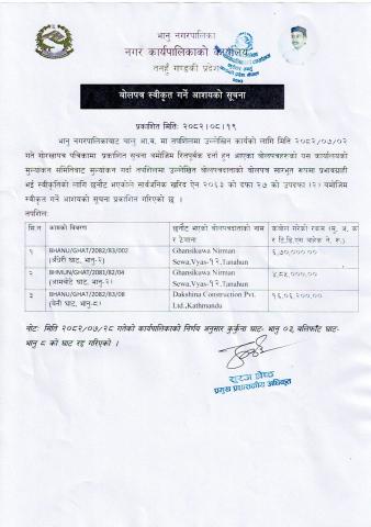 बोलपत्र स्वीकृत गर्ने आशयको सुचना !!!