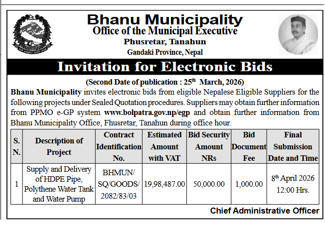 Invitation for Electronic Bids to Supply and Delivery of HDPE Pipe, Polythene Water Tank and Water Pump.